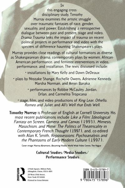 In this engaging cross-disciplinary study, Timothy Murray examines the artistic struggle over traumatic fantasies of race, gender, sexuality, and power. Establishing a retrospective dialogue between past and present, stage and video, Drama Trauma links the impact of trauma on recent political projects in performance and video with the specters of difference haunting Shakespeare's plays. The book provides close readings of cultural formations as diverse as Shakespearean drama, the Statue of Liberty, contemporary plays by women, African-American performance, and feminist interventions in video, performance and installation. The texts discussed include: * installations by Mary Kelly and Dawn Dedeaux, * plays by Ntozake Shange, Rochelle Owens, Adrienne Kennedy, Marsha Norman and Amiri Baraka * performances by Robbie McCauley, Jordan, Orlan, and Carmelita Tropicana * stage, film and video productions of King Lear, Othello, Romeo and Juliet and All's Well that Ends Well.