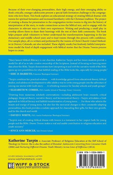 Because of their ever-changing personalities, their high energy, and their emerging ability to think critically, younger adolescents present a special faith formation challenge to the congregations who love them. This book explores an educational strategy of creating biblical dramas with tweens for spiritual formation and increased familiarity with the Christian tradition. The project of creating a drama for presentation to the congregation invites tweens to dig into the history of interpretation of the story, to make connections across the biblical text, and to engage with the characters in relevant ways to their own experiences. Writing and producing a small play in worship allows them to share their learnings with the rest of their faith community. The book helps prepare adult volunteers to better understand the transformations happening in the late elementary and middle school years and to lead tweens through this process with confidence. Five sample plays, all co-written and performed by the tweens of Christ Church United Methodist in Denver, Colorado, are also included. These slightly snarky but fearlessly faithful interpretations model the kind of depth engagement with biblical stories that the Drama Tweens process hopes to create.