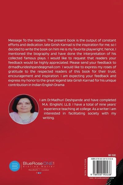 Message To the readers: The present book is the output of constant efforts and dedication, late Girish Karnad is the inspiration for me, so I decided to write the book on him He is my favorite playwright; hence, I wrote biography and have done the interpretation of his collected famous plays. The present book also focuses on the unique relevance of the playwright,it contains six chapters and Karnad's biography,his unique writing style,unique text which would be highly beneficial for the research in English Literature. I would like to request that readers your feedback would be highly appreciated. Please send your feedback to drmadhurideshpande@gmail.com I would like to express my roses of gratitude to the respected readers of this book for their trust , encouragement and inspiration. I am expecting your feedback & express my honor to the great legend late Girish Karnad for his unique contribution in Indian English Drama