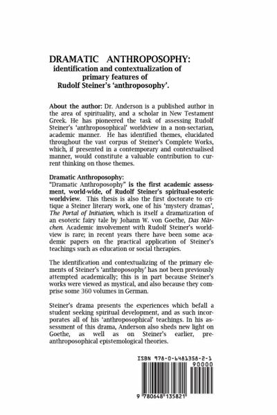 "Dramatic Anthroposophy" is the first academic assessment, world-wide, of Rudolf Steiner's spiritual-esoteric worldview. This thesis is also the first doctorate to critique a Steiner literary work, one of his 'mystery daramas', The Portal of Initiation, which is itself a dramatization of an esoteric fairy tale by Johann W. von Goethe, Das Märchen. Academic involvement with Rudolf Steiner's worldview is rare, in recent years there have been some academic papers on the practical application of Steiner's teachings such as education or social therapies. The identification and contextualizing of the primary elements of Steiner's 'anthroposophy' has not been previously attempted academically; this is in part because Steiner's works were viewed as mystical, and also because they comprise some 360 volumes in German. Steiner's drama presents the experiences which befall a student seeking spiritual development, and as such incorporates all of his 'anthroposophical' teachings. In his assessment of this drama, Anderson also sheds new light on Goethe, as well as on Steiner's earlier, pre-anthroposophical epistemological theories.