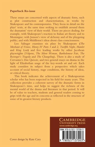These essays are concerned with aspects of dramatic form, such as plot construction and characterisation, in works by Shakespeare and his contemporaries. They focus in detail on the plays' texts, at the same time seeking to establish around them the dramatists' view of their world. Leo Salingar examines six plays by Shakespeare (The Merchant of Venice, Henry IV Parts 1 and 2, Twelfth Night, Hamlet and King Lear) and five leading works by other Jacobean playwrights (Volpone, The Silent Woman, Bartholomew Fair, The Revenger's Tragedy and The Changeling). There is also a study of Cervantes' Don Quixote, and two general essays on drama in the light of Elizabethan usage of the key words art and wit. Each study considers its subject from a perspective that takes account of social history, stage conditions, the history of ideas, or critical theory. The collection provides a coherent survey of the dramatic forms in Shakespeare's time.