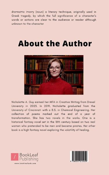 Nicholette A. Guy earned her MFA in Creative Writing from Drexel University in 2023. In 2019, Nicholette graduated from the University of Cincinnati with a B.S. in Chemical Engineering. Her collection of poems marked out the end of a year of transformation. She has two novels in the works. One is a historical fantasy novel set in the 18th century based on two real women who pretended to be men and became pirates. Her other book is a high fantasy novel exploring the volatility of healing.