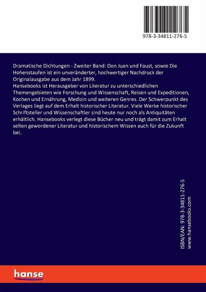 Dramatische Dichtungen - Zweiter Band: Don Juan und Faust, sowie Die Hohenstaufen ist ein unveränderter, hochwertiger Nachdruck der Originalausgabe aus dem Jahr 1899.Hansebooks ist Herausgeber von Literatur zu unterschiedlichen Themengebieten wie Forschung und Wissenschaft, Reisen und Expeditionen, Kochen und Ernährung, Medizin und weiteren Genres. Der Schwerpunkt des Verlages liegt auf dem Erhalt historischer Literatur. Viele Werke historischer Schriftsteller und Wissenschaftler sind heute nur noch als Antiquitäten erhältlich. Hansebooks verlegt diese Bücher neu und trägt damit zum Erhalt selten gewordener Literatur und historischem Wissen auch für die Zukunft bei.