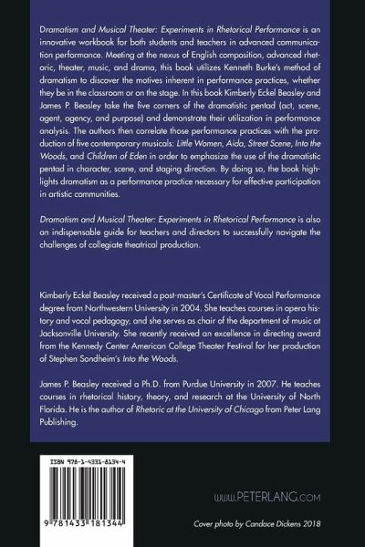 "Kimberly Eckel Beasley and James P. Beasley deliver rivetingly insightful approaches to Burkean Dramatism as a heuristic for creating and sustaining effective rhetorical performances. Framed within the timespan of the early days of the divisive Trump administration and concluding toward its demise, the book artfully examines how musical theater is especially capable of creating choratic spaces of potential for unity. Dramatism and Musical Theater: Experiments in Rhetorical Performance seems to be made for this moment, yet it also illuminates a return to the interdisciplinary value of writing, rhetoric, and theater pedagogy. The convergence of these scenes of rhetorical activity manifests a kairotic resacralization of the rhetorical canon of delivery. The book does more than simply explain 'the pentad' and imagine rhetors will know what to do with it. Instead, by sharing a sense of who Burke was and the range of his hopes, Beasley and Beasley offer Kenneth Burke's pentadic pedagogical approach in ways that reasonably reframe both written and theatrical performances as acts. When seen as acts through the pentad, we are better able to explore motivation and situatedness from within scenes of our performances, our lives, all toward increasingly choratic, and therefore at least momentarily 'unified,' participation in rhetorical performances, in life." -Dr. Bonnie Lenore Kyburz, Independent Scholar; Author of Cruel Auteurism: Affective Digital Meditations Toward Film-Composition