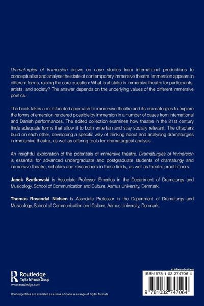 An insightful exploration of the potentials of immersive theatre,Dramaturgies of Immersion is essential for advanced undergraduate and postgraduate students of dramaturgy and immersive theatre, scholars and researchers in these fields, as well as theatre practitioners.
