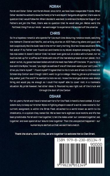 Korah Korah and Oshar. Oshar and Korah. Almost since birth, we have been inseparable friends. When Oshar decided he wished to leave his family's farm and depart Sanguinis altogether, there was no question that I would follow him. When I decided it was best to embrace the Mylos heritage of our fathers and join the Fleet, there was no question that he would also join. Mates were the farthest thing from our minds - we were eager to experience the wonders of the universe. Chris So I'm a hopeless romantic who spends far too much time devouring romance novels, watching the Hallmark Channel and Netflix, and writing stories on AO3 featuring aliens and guys who look suspiciously like the dude I see in the mirror every morning. Stories I knew would land me in hot water if my father ever found out and thanks to my latest stepmom snooping, that ship has now sailed. It doesn't matter that I've never even gone out on a date with a human, nor so much as met up for a coffee as friends with one of the real aliens present on our planet. I'm in water so hot, my goose has been boiled until all the meat has fallen off the bone. "If you're so in love with the Mylos," he said, "you might as well see if one of them even wants your sorry ass. I'll drive you there myself." I found myself frogmarched to his truck and driven to the nearest Scholarship Center even though I didn't want to go to college. I liked my job as a professional dog walker just fine and if he wanted to kick me out, I knew the local gas station was always hiring and would pay me enough so I could find myself able to cover rent in a roommate situation. My pride however, had other ideas. It flounced my ass right out of the truck and through the door of the Center. Oshar For six years, Korah and I have trained warriors for the Fleet in hand to hand combat. It's our solemn duty to keep our brother Mylos in fighting shape in case of a worst case scenario. Our current assignment is within the Bride Fleet attached to a world known as earth to its inhabitants, in a system they named Sol. We've been here eighteen local months and life has been predictable. Korah and I rise together, train the males under our command together, eat together, and even spend all our leisure time together. Then the unexpected happened - our kunnarskyns alerted us that we each had a match. Thank the stars, even in this, we are together to welcome him to Clan Drani.