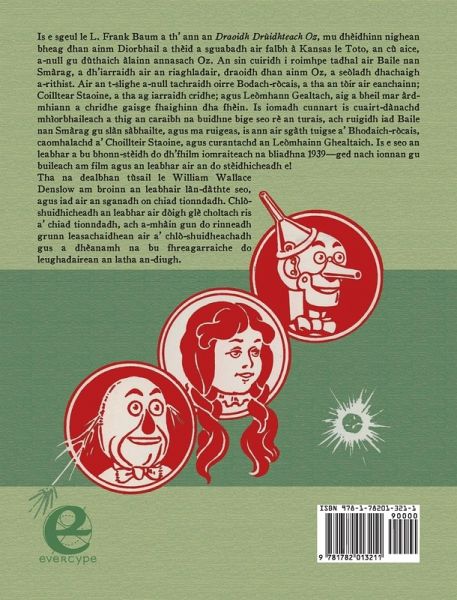 Is e sgeul le L. Frank Baum a th' ann an Draoidh Drùidhteach Oz, mu dhèidhinn nighean bheag dhan ainm Diorbhail a thèid a sguabadh air falbh à Kansas le Toto, an cù aice, a-null gu dùthaich àlainn annasach Oz. An sin cuiridh i roimhpe tadhal air Baile nan Smàrag, a dh'iarraidh air an riaghladair, draoidh dhan ainm Oz, a seòladh dhachaigh a-rithist. Air an t-slighe a-null tachraidh oirre Bodach-ròcais, a tha an tòir air eanchainn; Coilltear Staoine, a tha ag iarraidh cridhe; agus Leòmhann Gealtach, aig a bheil mar àrd-mhiann a chridhe gaisge fhaighinn dha fhèin. Is iomadh cunnart is cuairt-dànachd mhìorbhaileach a thig an caraibh na buidhne bige seo rè an turais, ach ruigidh iad Baile nan Smàrag gu slàn sàbhailte, agus ma ruigeas, is ann air sgàth tuigse a' Bhodaich-ròcais, caomhalachd a' Choillteir Staoine, agus curantachd an Leòmhainn Ghealtaich. Is e seo an leabhar a bu bhonn-stèidh do dh'fhilm iomraiteach na bliadhna 1939-ged nach ionnan gu buileach am film agus an leabhar air an do stèidhicheadh é! Tha na dealbhan tùsail le William Wallace Denslow am broinn an leabhair làn-dàthte seo, agus iad air an sganadh on chiad tionndadh. Chlò-shuidhicheadh an leabhar air dòigh glè choltach ris a' chiad tionndadh, ach a-mhàin gun do rinneadh grunn leasachaidhean air a' chlò-shuidheachadh gus a dhèanamh na bu fhreagarraiche do leughadairean an latha an-diugh. --- The Wonderful Wizard of Oz is L. Frank Baum's story of a little girl named Dorothy, who with her dog Toto is carried by a tornado from Kansas to the strange and beautiful land of Oz. Here she decides to visit the Emerald City to ask its ruler, a wizard called Oz, to send her back home again. On the way she meets a Scarecrow, who is in search of brains; a Tin Woodman, who wishes to have a heart; and a Cowardly Lion, whose one desire is to possess courage. The little party encounter many dangers and marvelous adventures on the way, but reach the Emerald City in safety, their success being due to the thoughtfulness of the Scarecrow, the tender care of the Tin Woodman, and the fearlessness of the Cowardly Lion. This is the book that inspired the famous 1939 film -- which differs from the original book in quite a few ways! This full-colour book contains the original illustrations by William Wallace Denslow which were were scanned from copies of the first edition. There are 24 colour plates and 150 text illustrations, many localized into Scottish Gaelic. The book has been typeset a fashion similar to that of the first edition, with some typographic improvements for the modern reader.