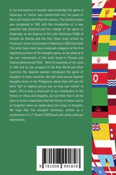 In the atmosphere of wisdom and knowledge the game of Alquerque of Twelve was transformed into the game of Marro de Punta in the fifteenth century. The transformation was completed in 1495 with the introduction of a new powerful lady (domina) and the change of the game of Andarraya, as we observe in the Latin dictionary (1495) of Antonio de Nebrija and the first chess book written by Francesch Vicent and printed in Valencia in 1495 (now lost). The latter book must have contained a diagram of the first beginning position of the draughts game, as we observe in the two manuscripts of this book found in Perugia and Cesena dated around 1500. With the expulsion of the Jews in 1492 and by the conquest of the New World and other countries the Spanish seamen introduced the game of draughts in many countries. We still come across Spanish draughts terms in the Philippines where they still use the word "eat" to capture pieces just as they use "comer" in Spain. This is only a small part of our contribution to the history of chess and draughts, but we think that it will be clear to future researchers that the history of chess cannot be forgotten when we speak about the origin of draughts. We hope that this draughts dictionary, written as a continuation of J.F. Moser's (1976) work will clarify unknown expressions.