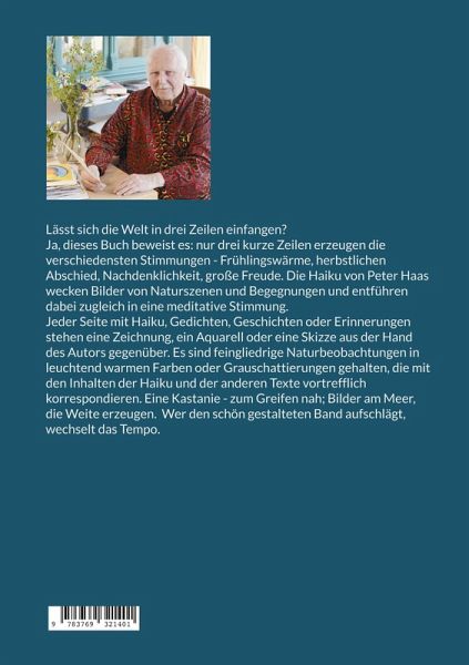 Lässt sich die Welt in drei Zeilen einfangen? Ja, dieses Buch beweist es: nur drei kurze Zeilen erzeugen die verschiedensten Stimmungen - Frühlingswärme, herbstlichen Abschied, Nachdenklichkeit, große Freude. Die Haiku von Peter Haas wecken Bilder von Naturszenen und Begegnungen und entführen dabei zugleich in eine meditative Stimmung. Jeder Seite mit Haiku, Gedichten oder längeren Texten stehen eine Zeichnung, ein Aquarell oder eine Skizze aus der Hand des Autors gegenüber. Es sind feingliedrige Naturbeobachtungen in leuchtend warmen Farben oder Grauschattierungen gehalten, die mit den Inhalten der Haiku und Texte vortrefflich korrespondieren. Eine Kastanie - zum Greifen nah; Bilder am Meer, die Weite erzeugen. Wer den schön gestalteten Band aufschlägt, wechselt das Tempo.