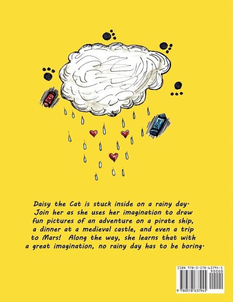 Daisy the Cat is stuck inside on a rainy day. Join her as she uses her imagination to draw fun pictures of an adventure on a pirate ship, a dinner at a medieval castle, and even a trip to Mars! Along the way, she learns that with a great imagination, no rainy day has to be boring.