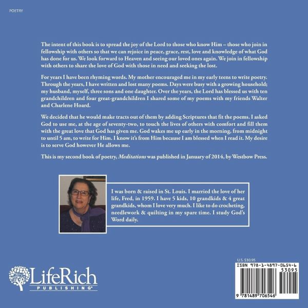 The intent of this book is to spread the joy of the Lord to those who know Him - those who join in fellowship with others so that we can rejoice in peace, grace, rest, love and knowledge of what God has done for us. We look forward to Heaven and seeing our loved ones again. We join in fellowship with others to share the love of God with those in need and seeking the lost. For years I have been rhyming words. My mother encouraged me in my early teens to write poetry. Through the years, I have written and lost many poems. Days were busy with a growing household; my husband, myself, three sons and one daughter. Over the years, the Lord has blessed us with ten grandchildren and four great-grandchildren I shared some of my poems with my friends Walter and Charlene Hoard. We decided that he would make tracts out of them by adding Scriptures that fit the poems. I asked God to use me, at the age of seventy-two, to touch the lives of others with comfort and fill them with the great love that God has given me. God wakes me up early in the morning, from midnight to until 5 am, to write for Him. I know it's from Him because I am blessed when I read it. My desire is to serve God however He allows me. This is my second book of poetry, Meditations was published in January of 2014, by Westbow Press.