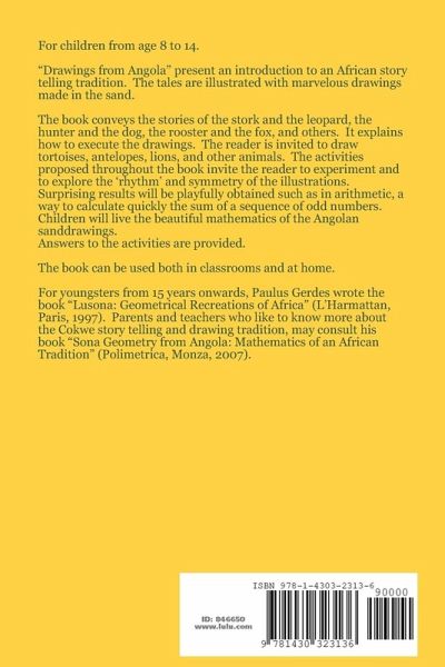 For children from age 8 to 14. "Drawings from Angola" present an introduction to an African story telling tradition. The tales are illustrated with marvelous drawings made in the sand. The book conveys the stories of the stork and the leopard, the hunter and the dog, the rooster and the fox, and others. It explains how to execute the drawings. The reader is invited to draw tortoises, antelopes, lions, and other animals. The activities proposed throughout the book invite the reader to experiment and to explore the 'rhythm' and symmetry of the illustrations. Surprising results will be playfully obtained, such as in arithmetic, a way to calculate quickly the sum of a sequence of odd numbers. Children will live the beautiful mathematics of the Angolan sanddrawings. Answers to the activities are provided. The book can be used both in classrooms and at home.