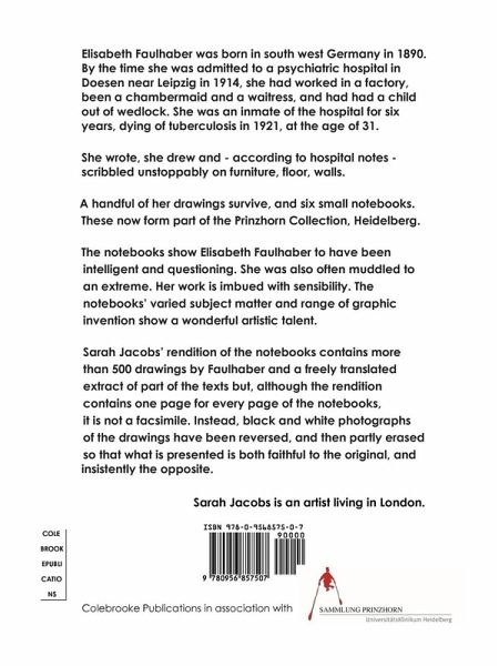 Elisabeth Faulhaber was born in south west Germany in 1890. By the time she was admitted to a psychiatric hospital in Doesen near Leipzig in 1914, she had worked in a factory, been a chambermaid and a waitress, and had had a child out of wedlock. She was an inmate of the hospital for six years, dying of tuberculosis in 1921, at the age of 31. She wrote, she drew and - according to hospital notes - scribbled unstoppably on furniture, floor, walls. A handful of her drawings survive, and six small notebooks. These now form part of the Prinzhorn Collection, Heidelberg. The notebooks show Elisabeth Faulhaber to have been intelligent and questioning. She was also often muddled to an extreme. Her work is imbued with sensibility. The notebooks¿ varied subject matter and range of graphic invention show a wonderful artistic talent. Sarah Jacobs¿ rendition of the notebooks contains more than 550 drawings by Faulhaber but, although the rendition contains one page for every page of the notebooks, it is not a facsimile. Instead, black and white photographs of the drawings have been reversed, and then partly erased so that what is presented is both faithful to the original, and insistently the opposite. Freely translated extracts from the Faulhaber¿s texts have also been included, together with a selection of the poems and songs which Faulhaber copied into her notebooks. These have been left in the original German. The rendition has been produced in association with Sammlung Prinzhorn, UniversitaetsKlinikum, Heidelberg. Sarah Jacobs is an artist living in London.