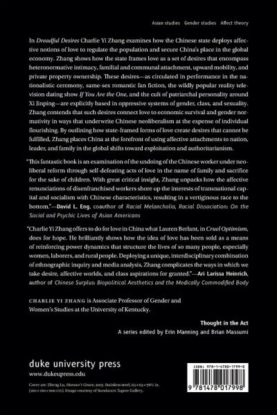 In Dreadful Desires Charlie Yi Zhang examines how the Chinese state deploys affective notions of love to regulate the population and secure China's place in the global economy. Zhang shows how the state frames love as a set of desires that encompass heteronormative intimacy, familial and communal attachment, upward mobility, and private property ownership. These desires-as circulated in performance in the nationalistic ceremony, same-sex romantic fan fiction, the wildly popular reality television dating show If You Are the One, and the cult of patriarchal personality around Xi Jinping-are explicitly based in oppressive systems of gender, class, and sexuality. Zhang contends that such desires connect love to economic survival and gender normativity in ways that underwrite Chinese neoliberalism at the expense of individual flourishing. By outlining how state-framed forms of love create desires that cannot be fulfilled, Zhang places China at the forefront of using affective attachments to nation, leader, and family in the global shifts toward exploitation and authoritarianism.