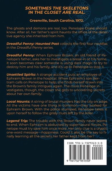 Sometimes the skeletons in the closet are real. Greenville, South Carolina, 1972. The ghosts and demons are real, too. Penelope Drake should know. After all, her father's spirit haunts the office of the detective agency she inherited from him. Dreadful Penny: Haunted Past collects the first four novellas in the Dreadful Penny series. Dreadful Penny: When Ephraim Brown, an old friend of Penelope's father, asks her to investigate a break-in at his home, it soon becomes clear someone is using dark magic to try to destroy him and his family, and it's up to Penelope to stop it. Unsettled Spirits: A strange accident puts an employee of Ephraim Brown in the hospital. When Ephraim's son Bertram calls on Penelope to help, she finds herself drawn into the Brown's family intrigues again. The more Penelope investigates, though, the closer she gets to uncovering secrets about her own family. Local Haunts: A string of brutal murders has the city on edge. All the victims have one thing in common-they worked for Ephraim Brown. With the police stumped, Penelope takes it upon herself to follow the grisly clues left by the killer. Legend Trip: The trouble with the Brown family never seems to end. When Ephraim is abducted by supernatural forces, Penelope must try save him once more. Her only clue is a cryptic one-word message-happiness. Could it also be the key to finally learning all the secrets her father kept from her?