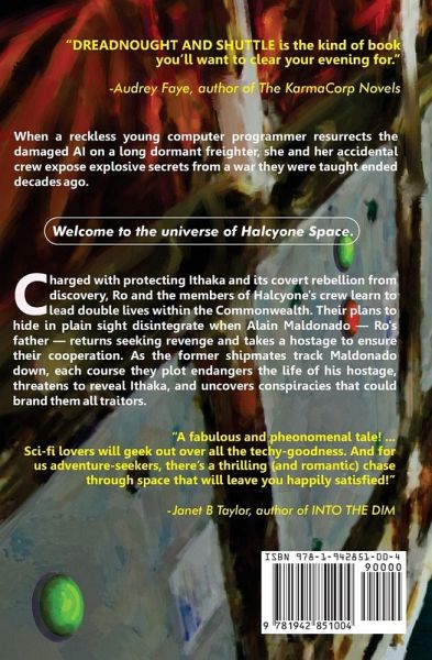 When a reckless young computer programmer resurrects the damaged AI on a long dormant freighter, she and her accidental crew expose explosive secrets from a war they were taught ended decades ago. Welcome to the universe of Halcyone Space. Charged with protecting Ithaka and its covert rebellion from discovery, Ro and the members of Halcyone's crew learn to lead double lives within the Commonwealth. Their plans to hide in plain sight disintegrate when Alain Maldonado - Ro's father - returns seeking revenge and takes a hostage to ensure their cooperation. As the former shipmates track Maldonado down, each course they plot endangers the life of his hostage, threatens to reveal Ithaka, and uncovers conspiracies that could brand them all traitors. DREADNOUGHT AND SHUTTLE is book 3 of the Halcyone Space series of science fiction space opera adventures that began with DERELICT and continued with ITHAKA RISING. PARALLAX, book 4 will be published in June of 2017.