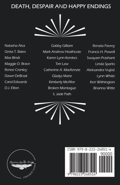 Death, Despair, and Happy Endings. Sad poetry with happy outcomes from 25 international poets. Aleksandra Vujisi¿ Brianna Witte Broken Montague Carol Edwards Catherine A. MacKenzie D.J. Elton Dawn DeBraal Francis H. Powell Gabby Gilliam Gladys Marie Cubias Greta T. Bates Karen Kerekes Keri Withington Kimberly McAfee Linda Sparks Lynn White Maggie D. Brace Mark Andrew Heathcote Max Bindi Natasha Alva Renata Pavrey Renee Cronley S. Jade Path Swayam Prashant Tim Law