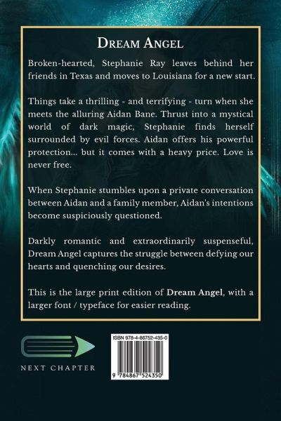 Broken-hearted, Stephanie Ray leaves behind her friends in Texas and moves to Louisiana for a new start. Things take a thrilling - and terrifying - turn when she meets the alluring Aidan Bane. Thrust into a mystical world of dark magic, Stephanie finds herself surrounded by evil forces. Aidan offers his powerful protection... but it comes with a heavy price. Love is never free. When Stephanie stumbles upon a private conversation between Aidan and a family member, Aidan's intentions become suspiciously questioned. Darkly romantic and extraordinarily suspenseful, Dream Angel captures the struggle between defying our hearts and quenching our desires. This is the large print edition of Dream Angel, with a larger font / typeface for easier reading.