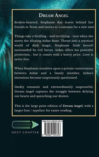Broken-hearted, Stephanie Ray leaves behind her friends in Texas and moves to Louisiana for a new start. Things take a thrilling - and terrifying - turn when she meets the alluring Aidan Bane. Thrust into a mystical world of dark magic, Stephanie finds herself surrounded by evil forces. Aidan offers his powerful protection... but it comes with a heavy price. Love is never free. When Stephanie stumbles upon a private conversation between Aidan and a family member, Aidan's intentions become suspiciously questioned. Darkly romantic and extraordinarily suspenseful, Dream Angel captures the struggle between defying our hearts and quenching our desires. This is the large print edition of Dream Angel, with a larger font / typeface for easier reading.