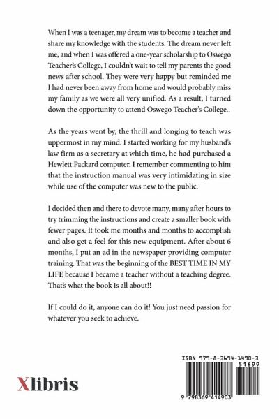 When I was a teenager, my dream was to become a teacher and share my knowledge with the students. The dream never left me, and when I was offered a one-year scholarship to Oswego Teacher's College, I couldn't wait to tell my parents the good news after school. They were very happy but reminded me I had never been away from home and would probably miss my family as we were all very unified. As a result, I turned down the opportunity to attend Oswego Teacher's College.. As the years went by, the thrill and longing to teach was uppermost in my mind. I started working for my husband's law firm as a secretary at which time, he had purchased a Hewlett Packard computer. I remember commenting to him that the instruction manual was very intimidating in size while use of the computer was new to the public. I decided then and there to devote many, many after hours to try trimming the instructions and create a smaller book with fewer pages. It took me months and months to accomplish and also get a feel for this new equipment. After about 6 months, I put an ad in the newspaper providing computer training. That was the beginning of the BEST TIME IN MY LIFE because I became a teacher without a teaching degree. That's what the book is all about!! If I could do it, anyone can do it! You just need passion for whatever you seek to achieve.