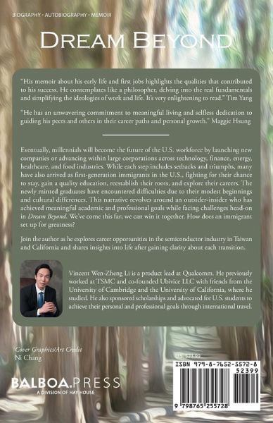 "His memoir about his early life and first jobs highlights the qualities that contributed to his success. He contemplates like a philosopher, delving into the real fundamentals and simplifying the ideologies of work and life. It's very enlightening to read." Tim Yang "He has an unwavering commitment to meaningful living and selfless dedication to guiding his peers and others in their career paths and personal growth." Maggie Hsung Eventually, millennials will become the future of the U.S. workforce by launching new companies or advancing within large corporations across technology, finance, energy, healthcare, and food industries. While each step includes setbacks and triumphs, many have also arrived as first-generation immigrants in the U.S., fighting for their chance to stay, gain a quality education, reestablish their roots, and explore their careers. The newly minted graduates have encountered difficulties due to their modest beginnings and cultural differences. This narrative revolves around an outsider-insider who has achieved meaningful academic and professional goals while facing challenges head-on in Dream Beyond. We've come this far; we can win it together. How does an immigrant set up for greatness? Join the author as he explores career opportunities in the semiconductor industry in Taiwan and California and shares insights into life after gaining clarity about each transition.