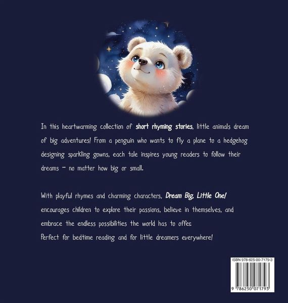 Dream Big, Little One! About the Dreams of Little Animals - From Pilots to Designers and Submarine Captains! In this heartwarming collection of short rhyming stories, little animals dream of big adventures! From a penguin who wants to fly a plane to a hedgehog designing sparkling gowns, each tale inspires young readers to follow their dreams-no matter how big or small. With playful rhymes and charming characters, Dream Big, Little One! encourages children to explore their passions, believe in themselves, and embrace the endless possibilities the world has to offer. Perfect for bedtime reading and for little dreamers everywhere! ¿ Ideal for ages 3-7 ¿ Encourages creativity, ambition, and self-confidence ¿ Beautifully illustrated and fun to read aloud