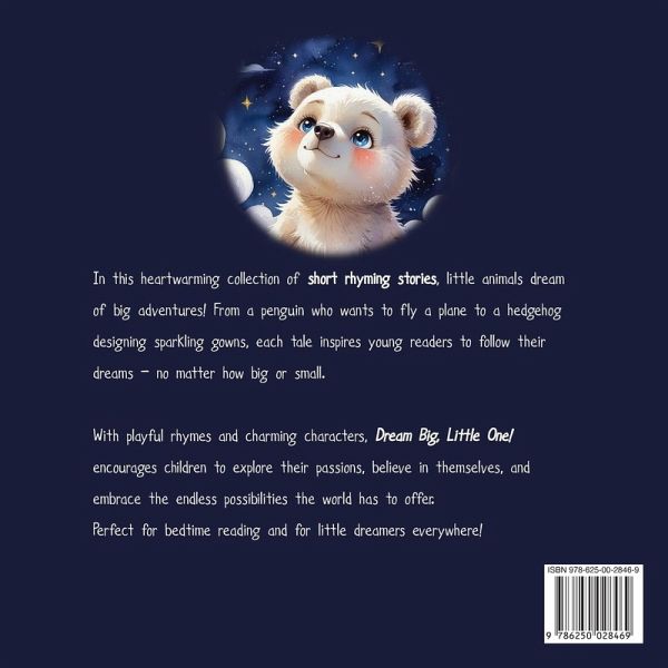 Dream Big, Little One! About the Dreams of Little Animals - From Pilots to Designers and Submarine Captains! In this heartwarming collection of short rhyming stories, little animals dream of big adventures! From a penguin who wants to fly a plane to a hedgehog designing sparkling gowns, each tale inspires young readers to follow their dreams-no matter how big or small. With playful rhymes and charming characters, Dream Big, Little One! encourages children to explore their passions, believe in themselves, and embrace the endless possibilities the world has to offer. Perfect for bedtime reading and for little dreamers everywhere! ¿ Ideal for ages 3-7 ¿ Encourages creativity, ambition, and self-confidence ¿ Beautifully illustrated and fun to read aloud