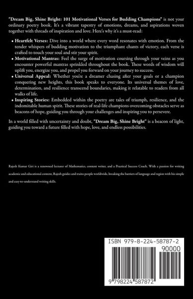 "Dream Big, Shine Bright: 101 Motivational Verses for Budding Champions" is not your ordinary poetry book. It's a vibrant tapestry of emotions, dreams, and aspirations woven together with threads of inspiration and love. Here's why it's a must-read:Heartfelt Verses: Dive into a world where every word resonates with emotion. From the tender whispers of budding motivation to the triumphant chants of victory, each verse is crafted to touch your soul and stir your spirit. Motivational Mantras: Feel the surge of motivation coursing through your veins as you encounter powerful mantras sprinkled throughout the book. These words of wisdom will uplift you, energize you, and propel you forward on your journey to success. Universal Appeal: Whether you're a dreamer chasing after your goals or a champion conquering new heights, this book speaks to everyone. Its universal themes of love, determination, and resilience transcend boundaries, making it relatable to readers from all walks of life. Inspiring Stories: Embedded within the poetry are tales of triumph, resilience, and the indomitable human spirit. These stories of real-life champions overcoming obstacles serve as beacons of hope, guiding you through your challenges and inspiring you to persevere. In a world filled with uncertainty and doubt, "Dream Big, Shine Bright" is a beacon of light, guiding you toward a future filled with hope, love, and endless possibilities.