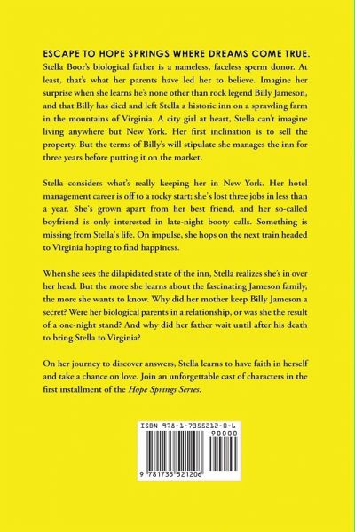When one young woman summons the courage to take a chance on life, she discovers the career and man of her dreams. Stella Boor's biological father is a nameless, faceless sperm donor. At least, that's what her parents have led her to believe. Imagine her surprise when she learns he's none other than rock legend Billy Jameson, and that Billy has died and left Stella a historic inn on a sprawling farm in the mountains of Virginia. A city girl at heart, Stella can't imagine living anywhere but New York. Her first inclination is to sell the property. But the terms of Billy's will stipulate she manages the inn for three years before putting it on the market. Stella considers what's really keeping her in New York. Her hotel management career is off to a rocky start; she's lost three jobs in less than a year. She's grown apart from her best friend, and her so-called boyfriend is only interested in late-night booty calls. Something is missing from Stella's life. On impulse, she hops on the next train headed to Virginia hoping to find happiness. When she sees the dilapidated state of the inn, Stella realizes she's in over her head. But the more she learns about the fascinating Jameson family, the more she wants to know. Why did her mother keep Billy Jameson a secret? Were her biological parents in a relationship, or was she the result of a one-night stand? And why did her father wait until after his death to bring Stella to Virginia? On her journey to discover answers, Stella learns to have faith in herself and take a chance on love. Join an unforgettable cast of characters in the first installment of the Hope Springs Series.
