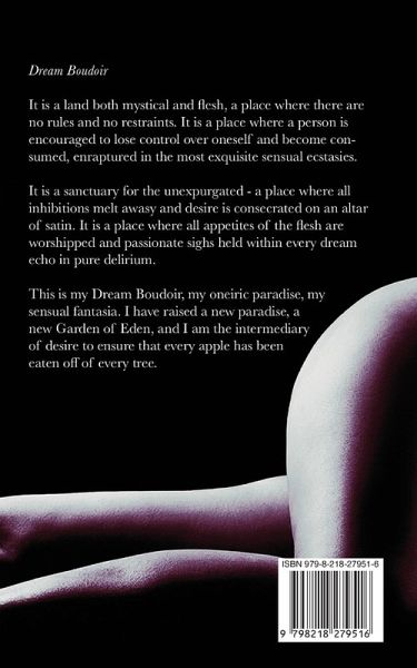 Dream Boudoir is a land both mystical and flesh, a place where there are no rules and no restraints. It is a place where a person is encouraged to lose control over oneself and become consumed, enraptured in the most exquisite sensual ecstasies. It is a sanctuary for the unexpurgated - a place where all inhibitions melt away and desire is consecrated on an altar of satin. It is a placed where all appetites of the flesh are worshipped and passionate sighs held within every dream echo in pure delirium. This is my Dream Boudoir, my oneiric paradise, my sensual fantasia.... I have raised a new paradise, a new Garden of Eden, and I am the intermediary of desire to ensure that every apple has been eaten off of every tree.