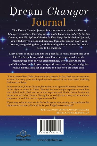 This Dream Changer Journal is a companion to the book Dream Changer: Transform Your Nightmares into Victories, Find Help for Bad Dreams, and Win Spiritual Battles in Your Sleep. In this helpful journal, you will discover a clear and practical format for writing down your dreams, categorizing them, and discerning whether or not the dream needs to be changed Every dream is unique and has the potential to reveal insight into your life. That's the beauty of dreams. Each one is personal and the meaning depends on your circumstances. Fortunately, there are guidelines that can help you interpret dreams, and this practical guide reveals helpful tools for beginners and seasoned dreamers alike.