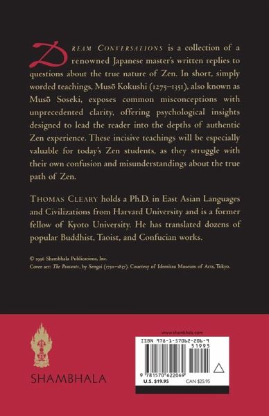 Dream Conversations is a collection of a renowned Japanese master's written replies to questions about the true nature of Zen. In short, simply worded teachings, Muso Kokushi (1275-1351), also known as Muso Soseki, exposes common misconceptions with unprecedented clarity, offering psychological insights designed to lead the reader into the depths of authentic Zen experience. These incisive teachings will be especially valuable for today's Zen students, as they struggle with their own confusion and misunderstandings about the true path of Zen.
