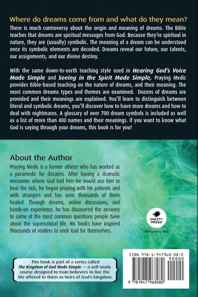 Where do dreams come from and what do they mean? There is much discussion today about where dreams come from and what they mean. The Bible teaches that dreams are spiritual messages from God. Because they're spiritual in nature, they are (usually) symbolic. The meaning of a dream can be understood once its symbolic elements are decoded. Dreams reveal our future, our talents, our assignments and our divine destiny. With the same down-to-earth teaching style used in Hearing God's Voice Made Simple and Seeing in the Spirit Made Simple, Praying Medic provides Bible-based teaching on the nature of dreams and their meaning. The most common dreams types and themes are examined. Dozens of dreams are provided and their meanings are explained. You'll learn to distinguish between literal and symbolic dreams, you'll discover how to have more dreams and how to deal with nightmares. A glossary of over 700 dream symbols is included as well as a list of more than 400 names and their meanings. If you want to know what God is saying through your dreams, this book is for you! Topics covered: The origin of dreams The purpose of dreams How to record dreams How to apply dreams How to receive dreams Dreams and emotions Dreams of future events Your unique dream language Dreams and your divine destiny The most common dream subjects Principles of dream interpretation Understanding dream complexity How to interpret conceptual dreams The meaning of words and symbols The meaning of recurring dreams and nightmares The symbolic meaning of buildings, vehicles and certain people The symbolic meaning of names, colors, numbers and directions How to tell if a dream should be interpreted literally or symbolically