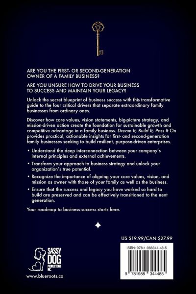 ARE YOU THE FIRST- OR SECOND-GENERATION OWNER OF A FAMILY BUSINESS? ARE YOU UNSURE HOW TO DRIVE YOUR BUSINESS TO SUCCESS AND MAINTAIN YOUR LEGACY? Unlock the secret blueprint of business success with this transformative guide to the four critical drivers that separate extraordinary family businesses from ordinary ones. Discover how core values, vision statements, big-picture strategy, and mission-driven action create the foundation for sustainable growth and competitive advantage in a family business. Dream It, Build It, Pass It On provides practical, actionable insights for first- and second-generation family businesses seeking to build resilient, purpose-driven enterprises.Understand the deep interconnection between your company's internal principles and external achievements. Transform your approach to business strategy and unlock your organization's true potential. Recognize the importance of aligning your core values, vision, and mission as owner with those of your family as well as the business. Ensure that the success and legacy you have worked so hard to build are preserved and can be effectively transitioned to the next generation. Your roadmap to business success starts here.