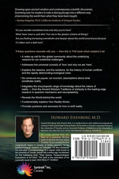 Award winner author, Howard Eisenberg, M.Sc. (Psych), M.D., is a medical doctor with additional postgraduate training in psychology and psychiatry. He has been a lecturer at the University of Toronto and an associate professor of Medicine at the University of Vermont. He is also the CEO of the international consultancy Syntrek® Inc.On a more personal level, he's been on a passionate lifelong quest to discover the true nature of reality.He was awarded the first postgraduate degree in Canada at McGill University for his highly successful research on Telepathy. He then pioneered the instruction of Parapsychology as a regular credit course at the University of Toronto.