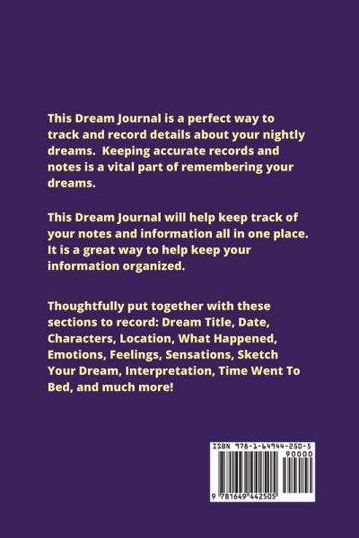 This Dream Journal book is perfect for writing your dreams down and write their interpretations. Each page contains space to record: Dream Title, Date, Characters, Locations Describe What Happened In The Dream Emotions Experienced, Feelings/Sensations Sketch Your Dream Interpretation, Dream's Message & Importance Time Went To Bed, Where Slept, Mood At Bedtime Quality Of Sleep, Eaten Before Bed Nighttime Notes Page (Blank Lined, Ruled) Great to keep by your bedside you can write in, keep track and use daily. The notes pages you are free to write any gratitude goals, inspirational thoughts or get creative. Will also make a great gift. Size is 6x9 inches, 106 pages, soft matte finish cover, white paper, paperback.