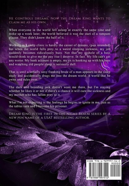 He controls dreams. Now the Dream King wants to claim me as his own. When everyone in the world fell asleep at exactly the same time and woke up a week later, the world believed it was the start of a rampant plague. They didn't know the half of it. Working in a sleep clinic is hardly the career of dreams, (pun intended) but when the world falls prey to a weird sleeping sickness, my job suddenly becomes ridiculously busy. Not that my asshole of a boss would think to give me the pay rise I deserve. In fact. My life can't get any worse. My bank account is empty, my ex is hooking up with his boss and watching old people sleep is seriously dull. That is until a lethally sexy freaking brute of a man appears in the sleep study and accidentally drags me into the dream world. A world that he owns and rules over. The dark and brooding jerk doesn't want me there, but I'm staying whether he likes it or not if there's a chance it will cure the sickness and my mother who has fallen prey to it. What I'm not expecting is the feelings he begins to ignite in me, just as the tables turn and I become his prisoner. Dream King is the first in the Night Realm series by a new pen name of a USAT bestselling author. This is an enemies to lovers wring-your-heart-out book for fans of Laura Thalassa, Jennifer L. Armentrout, Sarah J. Maas, and C.N. Crawford Scroll up and grab this before the Dream King takes you too.