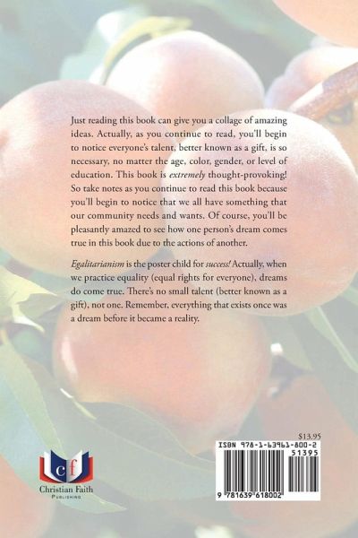Just reading this book can give you a collage of amazing ideas. Actually, as you continue to read, you'll begin to notice everyone's talent, better known as a gift, is so necessary, no matter the age, color, gender, or level of education. This book is extremely thought-provoking! So take notes as you continue to read because you'll stand to notice that we all have something that our community needs. Of course, you'll be pleasantly amazed to see how one person's dream comes true in this book due to the actions of another. Egalitarianism is the poster child for success! Actually, when we practice equality (equal rights for everyone), dreams do come true. There's no small talent (better known as a gift), not one. Remember, everything that exists once was a dream before it became a reality.