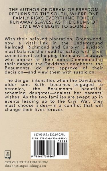 The author of Dream of Freedom returns to the South, where one family risks everything to help runaway slaves, as the drums of Civil War begin to sound. With their beloved plantation, Greenwood, now a vital link in the Underground Railroad, Richmond and Carolyn Davidson must balance the need for safety with their commitment to helping the many runaways who appear at their door. Compounding their danger, the Davidson’s neighbors, the Beaumonts, do not approve of their decision—and view them with suspicion. The danger intensifies when the Davidsons’ older son, Seth, becomes engaged to Veronica, the Beaumonts’ beautiful, scheming daughter—against her parents’ wishes. As the two families are swept up in events leading up to the Civil War, they must choose sides—in a conflict that will change their lives forever.