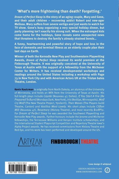 Dream of Perfect Sleep is the story of an ageing couple, Mary and Gene, and their adult children - recovering-addict Robert and new-ager Melissa. Mary suffers from severe vertigo and just wants to watch her TV show. Gene is busy organizing a very special holiday dinner, but party planning isn't exactly his strong suit. When the estranged kids come home for the holidays, Gene reveals some unexpected news that threatens to destroy the family's already strained bonds. A funny, heartwarming and powerful story of hope and loss in the face of dementia and terminal illness as an elderly couple plan their last days on earth. Winner of both the Kernodle New Play and Southwestern Playwriting Awards.