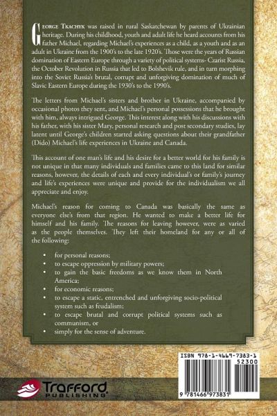 Michael Tkaczyk was one of thousands of immigrants who came to Canada from a region that is today known as Ukraine. Ukraine's size and borders have changed many times over the centuries due to social and political changes in Eastern Europe. Historically, the people who emigrated to Canada from Western Ukraine were of Ukrainian origin but their country of origin was recorded differently at different times, due to political borders changing or occupation by foreign military powers. The ships' logs, personal passports and immigration documentation often listed Ukrainians' country of origin as Galicia, Ruthenia, Bukovina, Romania, Austria, Poland or Russia. Michael's reason for coming to Canada was basically the same as everyone else's from that region. He wanted to make a better life for himself and his family. The reasons for leaving however, were as varied as the people themselves. They left their homeland for any or all of the following: ¿ for personal reasons; ¿ to escape oppression by military powers; ¿ to gain the basic freedoms as we know them in North America; ¿ for economic reasons; ¿ to escape a static, entrenched and unforgiving socio-political system such as feudalism; ¿ to escape brutal and corrupt political systems such as communism, or ¿ simply for the sense of adventure.