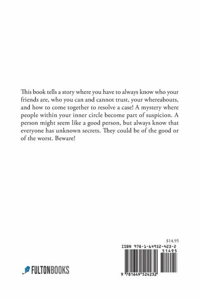 This book tells a story where you have to always know who your friends are, who you can and cannot trust, your whereabouts, and how to come together to resolve a case! A mystery where people within your inner circle become part of suspicion. A person might seem like a good person, but always know that everyone has unknown secrets. They could be of the good or of the worst. Beware!