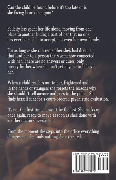 Can the child be found before it's too late or is she facing heartache again? Felicity has spent her life alone, moving from one place to another hiding a part of her that no one has ever been able to accept, not even her own family. For as long as she can remember she's had dreams that lead her to a person that's somehow connected with her. There are no answers or cures, only misery for her when she can't get anyone to believe her. When a child reaches out to her, frightened and in the hands of strangers she forgets the reasons why she shouldn't tell anyone and goes to the police. She finds herself sent for a court-ordered psychiatric evaluation. It's not the first time, it won't be the last. She packs up once again, ready to move as soon as she's done with another doctor's assessment. From the moment she steps into the office everything changes and she finds nothing she expected.