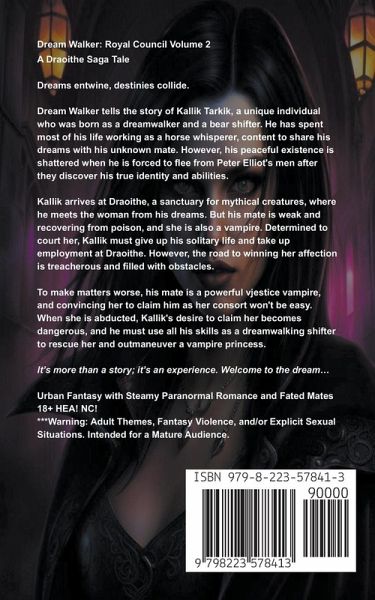 Dream Walker Royal Council Volume 2 A Draoithe Saga Tale Dreams entwine, destinies collide. Dream Walker tells the story of Kallik Tarkik, a unique individual who was born as a dreamwalker and a bear shifter. He has spent most of his life working as a horse whisperer, content to share his dreams with his unknown mate. However, his peaceful existence is shattered when he is forced to flee from Peter Elliot's men after they discover his true identity and abilities. Kallik arrives at Draoithe, a sanctuary for mythical creatures, where he meets the woman from his dreams. But his mate is weak and recovering from poison, and she is also a vampire. Determined to court her, Kallik must give up his solitary life and take up employment at Draoithe. However, the road to winning her affection is treacherous and filled with obstacles. To make matters worse, his mate is a powerful vjestice vampire, and convincing her to claim him as her consort won't be easy. When she is abducted, Kallik's desire to claim her becomes dangerous, and he must use all his skills as a dreamwalking shifter to rescue her and outmaneuver a vampire princess. Dream Walker is the second volume in Royal Council, an urban fantasy with paranormal romance. Enjoy a thrilling tale of love, survival, and perseverance, set in a world where mythical creatures and humans coexist, and danger lurks around every corner in Ophelia Kee's latest addition to the Draoithe Saga. Will Kallik succeed in his quest to win his mate's heart and protect her from harm, or will his dreams turn into a nightmare? It's more than a story; it's an experience. Welcome to the dream... Urban Fantasy with Steamy Paranormal Romance and Fated Mates 18+ HEA! NC! ***Warning: Adult Themes, Fantasy Violence, and/or Explicit Sexual Situations. Intended for a Mature Audience.