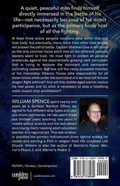 A quiet, peaceful man finds himself directly immersed in the battle of his life-not necessarily because of his direct participance, but as the primary body host of all the fighting. At least three active persona locations exist within this one host body, but eventually, many more from other host bodies will answer the call to battle. Captain Shadow-Claw is left to act as the only common focus point that all the different persona leaders seem to trust. He must fight to protect all persona existences against the exponentially growing dark corruption that is trying to become the dominant and permanent controlling resident. But how will the newly accepted member of the Interstellar Alliance Forces take responsibility for all these forces while under the command of a ten-foot-tall female dragon flight admiral? And will this middle-aged warrior realize his real power and do what is necessary to stop a headlong crash toward total annihilation?