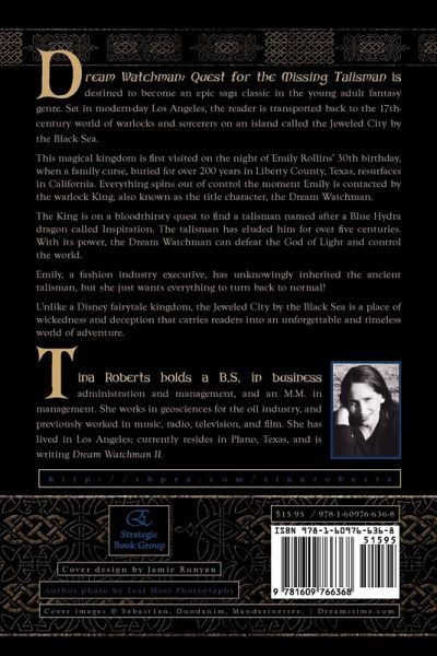 Dream Watchman: Quest for the Missing Talisman is destined to become an epic saga classic in the young adult fantasy genre. Set in modern-day Los Angeles, the reader is transported back to the 17th-century world of warlocks and sorcerers on an island called the Jeweled City by the Black Sea. This magical kingdom is first visited on the night of Emily Rollins' 30th birthday, when a family curse, buried for over 200 years in Liberty County, Texas, resurfaces in California. Everything spins out of control the moment Emily is contacted by the warlock King, also known as the title character, the Dream Watchman. The King is on a bloodthirsty quest to find a talisman named after a Blue Hydra dragon called Inspiration. The talisman has eluded him for over five centuries. With its power, the Dream Watchman can defeat the God of Light and control the world. Emily, a fashion industry executive, has unknowingly inherited the ancient talisman, but she just wants everything to turn back to normal! Unlike a Disney fairytale kingdom, the Jeweled City by the Black Sea is a place of wickedness and deception that carries readers into an unforgettable and timeless world of adventure. Tina Roberts holds a B.S. in business administration and management, and an M.M. in management. She works in geosciences for the oil industry, and previously worked in music, radio, television, and film. She has lived in Los Angeles; currently resides in Plano, Texas, and is writing Dream Watchman II.