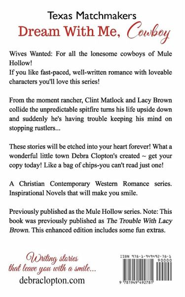 Wives Wanted: For all the lonesome cowboys of Mule Hollow! If you like fast-paced, well-written romance with loveable characters you'll love this series! From the moment rancher, Clint Matlock and Lacy Brown collide the unpredictable spitfire turns his life upside down and suddenly he's having trouble keeping his mind on stopping rustlers... These stories will be etched into your heart forever! What a wonderful little town Debra Clopton's created ~ get your copy today! Like a bag of chips-you can't read just one! A Christian Contemporary Western Romance series. Inspirational Novels that will make you smile. Previously published as the Mule Hollow series. Note: This book was previously published as The Trouble With Lacy Brown. This enhanced edition includes some fun extras. More Books inTexas Matchmakers (Christian Inspirational Contemporary Romance) 1-Dream With Me, Cowboy (Book 1 FREE) 2-Be My Love, Cowboy 3-This Heart's Your, Cowboy 4-Hold Me, Cowboy 5-Be Mine, Cowboy 6-Operation: Married by Christmas 7-Cherish Me, Cowboy 8-Surprise Me, Cowboy 9-Serenade Me, Cowboy 10-Return To Me, Cowboy 11-Love Me, Cowboy 12-Ride With Me, Cowboy 13-Dance With Me, Cowboy