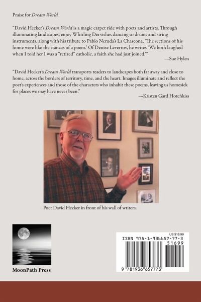 "David Hecker's Dream World is a magic carpet ride with poets and artists. Through illuminating landscapes, enjoy Whirling Dervishes dancing to drums and string instruments, along with his tribute to Pablo Neruda's La Chascona, 'The sections of his home were like the stanzas of a poem.' Of Denise Levertov, he writes 'We both laughed when I told her I was a "retired" catholic, a faith she had just joined.'" -Sue Hylen "David Hecker's Dream World transports readers to landscapes both far away and close to home, across the borders of territory, time, and the heart. Images illuminate and reflect the poet's experiences and those of the characters who inhabit these poems, leaving us homesick for places we may have never been." -Kristen Gard Hotchkiss