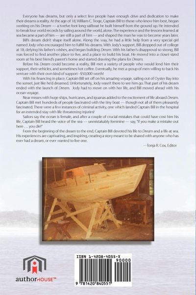 Everyone has dreams, but only a select few people have enough drive and dedication to make their dreams a reality. At the age of 18, William C. Troge, Captain Bill to those who know him best, began working on his Dream - a twelve foot long sailboat he built himself from the ground up. He intended to break four world records by sailing around the world, alone. Before his Dream could become a reality, Bill met a variety of people who would lend him their support. Eventually, he met a group of men willing to back his venture with their own kind of support--$50,000 worth! With his financing in place, Captain Bill set off on his amazing voyage, sailing out of Oyster Bay into the sunset, just like he'd dreamed. The experience and the lessons learned at sea became a part of him - are still a part of him - and shaped the man he was to become years later. His experiences are captivating, and inspiring, creating a story meant to be shared with anyone who has ever had a dream, or ever wanted to live one.