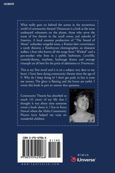 What really goes on behind the scenes in the mysterious world of community theatre? Dreamcast is a look at the most underpaid volunteers on the planet, those who serve the muse of live theatre in the small towns and suburbs of America. A local amateur production of "The Sound of Music" unleashes vengeful nuns, a Korean beer connoisseur, a randy director, a flamboyant choreographer, an obsessive stalker, a brat who knows all the songs from "Wicked" and a pot-smoker who lives in a public bathroom. Love/life, comedy/drama, mayhem, backstage drama and onstage triumph are all here for the price of admission to Dreamcast. This is my first novel and it is on a subject very dear to my heart. I have been doing community theatre since the age of 9. Why do I keep doing it? I don't get paid, in fact it costs me money. The glory is fleeting and the hours are awful. I wrote this book in part to answer that question.